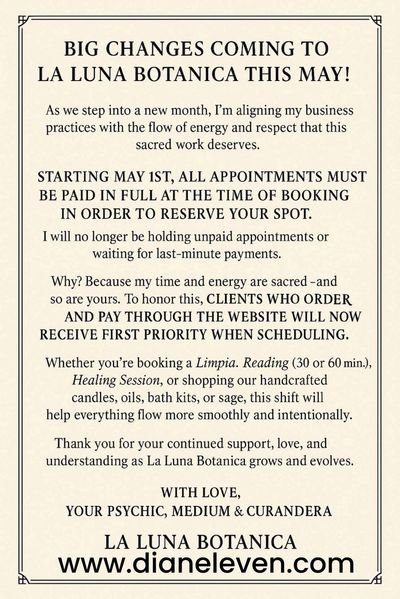 Whether you’re booking a Limpia, Reading (30 or 60 min), Healing Session, or shopping our handcrafted candles, oils, bath kits, or sage, this shift will help everything flow more smoothly and intentionally.